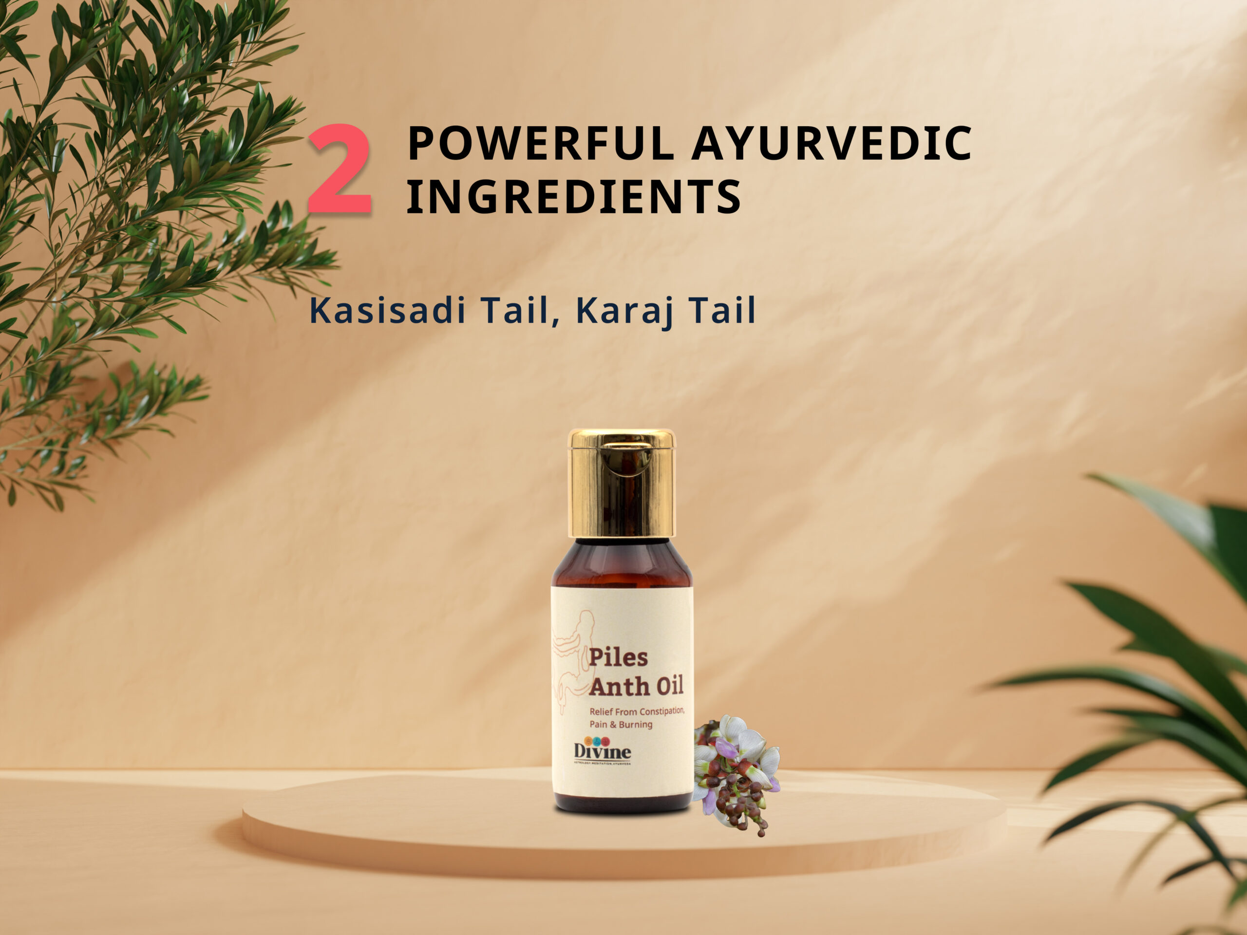 It contains ingredients like Kasisadi and Karanj oil that help in lessening the swelling of piles and compressing the enlarged anus. They are also powerful potents in the oil due to their astringent and anti-inflammatory properties.