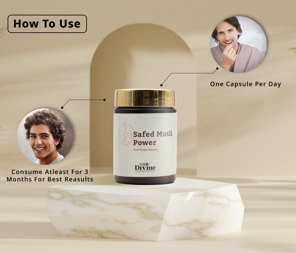 Divine provides you with potent safed musli power booster capsules made from extracts of safed musli herb. It surely helps you increase your performance and fasten your post workout recovery. CHAR(10) How to Use :- Warning :- Recommended Dosage – One capsule per day Content :- SAFED MUSLI 500MG Use :- Power Booster